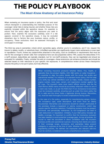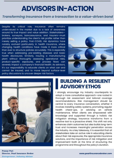 We at Pearl Insurance Broker place a high value on developing strong relationships with our clients and insurers by providing personalized services and assistance at all stages, beginning with risk identification, risk assessment, risk improvement strategies, comprehensive coverages, competitive terms, and seamless claim servicing. The focus is always on understanding our clients’ needs and offering them with a win-win scenario in terms of appropriate and comprehensive coverage combined with premium optimization.